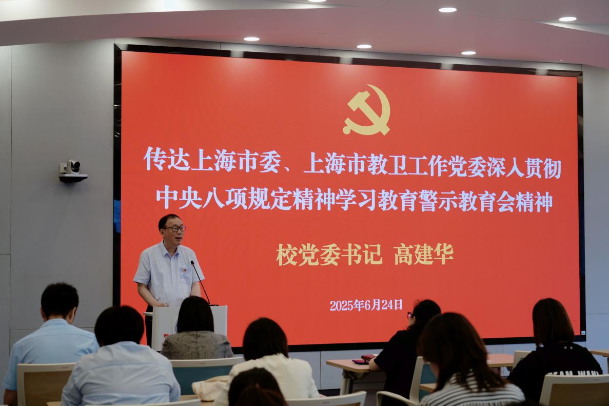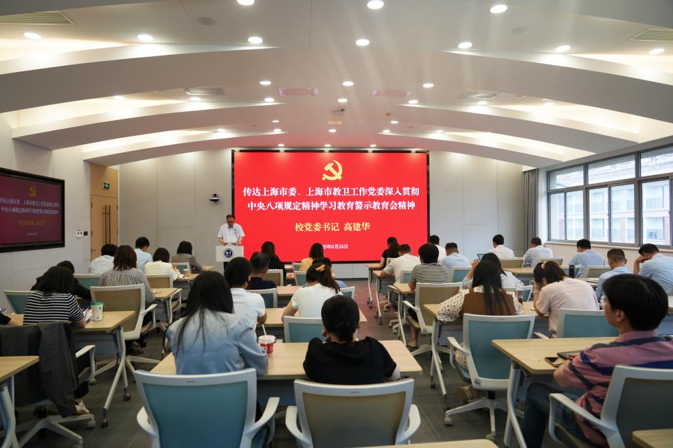 高建华传达上海市委、上海市教卫工作党委深入贯彻中央八项规定精神学习教育警示教育会精神,深入学习贯彻习近平总书记关于作风建设的重要论述和重要指示批示精神。高建华通过结合有关文件和会议内容,传达落实相关会议精神,要求广大党员干部把握当前形势任务,明确工作方向,强化责任担当,推动全面从严治党向纵深发展。