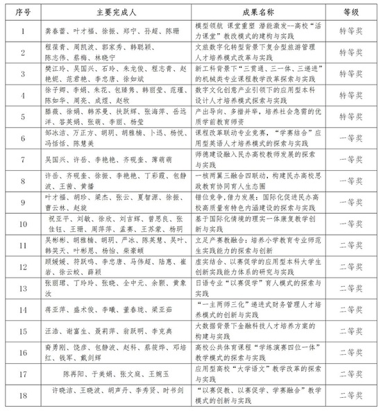 根据《上海师范大学天华学院关于开展2021年校级教学成果奖申报工作的通知》,在各二级学院(部门)组织上报,科研处审核,校学术委员会评选基础上,经学校研究决定,《模型领航 课堂重塑 潜能激发--高校“活力课堂”教改模式的建构与实践》等5个项目为校级教学成果奖特等奖;《课程改革联动专业竞赛,“学赛结合”应用型英语人才培养模式的探索与实践》等5个项目为校级教学成果奖一等奖;《立足产赛教融合:培养小学教育专业师范生实践能力的探索与创新》等8个项目为校级教学成果奖二等奖。现定于2021年6月28日至2021年7月5日,对2021年校级教学成果奖获奖名单(见附件)进行公示。