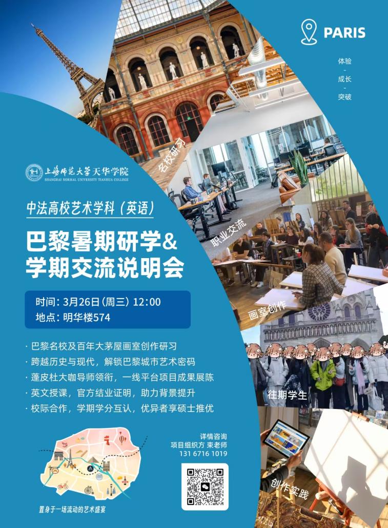 法国顶尖艺术院校,学校官方合作时间:03.26(周三)12:00~13:00地点:明华楼574项目咨询1.项目组织方咨询:束老师131 6716 1019(微信同号)2.校内项目咨询:赵诗佳老师(明华楼577)3.咨询电话:021-399661794.校内报名地点:王樨婷老师 (明华楼572)报名流程:1.填写校内《交流项目报名表》或《国际组织实习项目报名表》2.组织方项目报名3.签证办理等