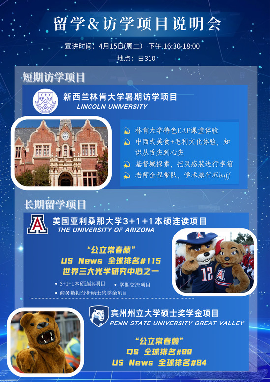 时间: 4月15日(周二) 下午16:30-18:00地点: 日310内容:1)访学项目新西兰林肯大学暑期访学项目2)留学项目美国亚利桑那大学3+1+1本硕连读项目 #115宾州州立大学硕士奖学金项目#89